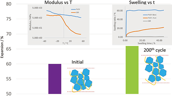 如图五所示,随温度变化的模量表明,SBR由于其较高的转变温度而可能不适用于低温应用。 同时,PVDF本身在电解液中具有更大的溶胀性,尤其是在较高温度下。与粘结剂溶胀一起,PVDF中的初级和次级颗粒电极在循环过程中可能还会发生体积变化,这可能会导致整个电极膨胀。