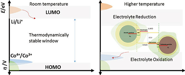 当LIBs达到一个高于40°C的温度后,其固相扩散率或液体扩散率都会增加,加快反应速度,从而有利于提高循环性能和倍率性能。然而,最严重的问题是与SEI或CEI相关的热力学和动力学。根据能斯特方程,温度升高正极和负极能级向负方向移动,两个电极的电子能级都会跃迁,同时,HOMO和LUMO也随着温度的升高而移动。当电解液的HOMO高于正极能级时,电子很容易从电解液转移到正极活性物质上,从而引起电解液氧化。这通常被认为不会发生在室温下,因为大多数电解液的氧化电位高于5V。意味着电解液和正极界面上的电化学反应,需要一个稳定的CEI来保证LIBs的电化学性能。关于阳极,电子能级正向移动,同时,电解质的LUMO被认为是负向移动,这一起使界面/中间相在温度升高时更具反应性。这意味着需要更稳定甚至更厚的SEI来促进阳极电化学。在热力学上,高温提高了阳极和阴极的电子能级,并使HOMO / LUMO移动并缩小了它们之间的间隙,这使原始的SEI和CEI在高温下不稳定。那些化学或电化学反应的产物会引入不利于SEI和CEI形成的链反应,而是对LIB电化学产生负面影响。因此,从图六中可以看出,从室温到高温,电子能级和电极电势以及电解质的HOMO / LUMO能级之间的关系。另一个问题,因为热力学和动力学都表明高温操作使热失控的可能性更大,这是一个主要的安全问题。