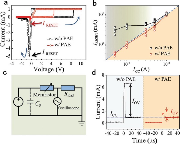 b)忆阻器电流过冲效应等效电路图,过冲电流(IOV)可以流经两条平行路径:导电通道(IOV-CF)和薄膜(IOV-Film)。