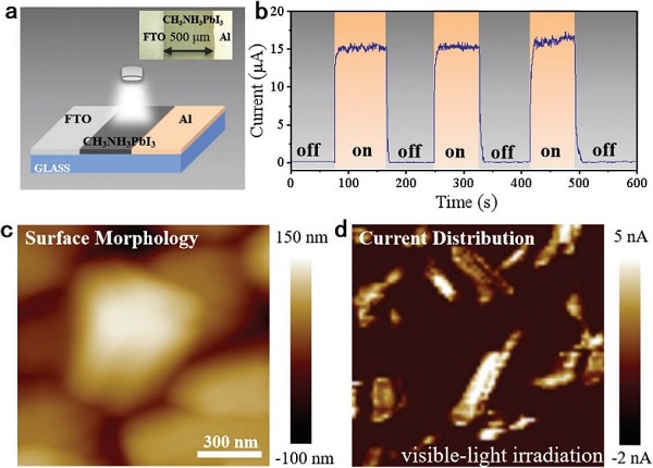 c-d)MAPbI3薄膜的表面形貌及光照下相应光电流分布的原子力显微表征。