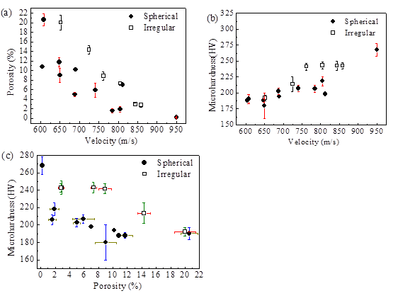(a)为Ti粒子撞击速度和沉积体孔隙率的关系,(b)为Ti粒子撞击速度和沉积体显微硬度的关系,(c)为Ti沉积体孔隙率和显微硬度的关系