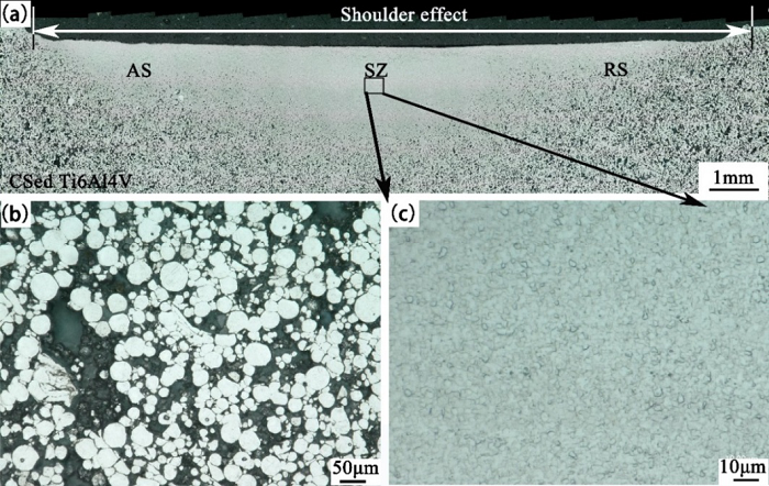 图14 冷喷涂Ti6Al4V沉积体经过搅拌摩擦加工处理后的微观组织