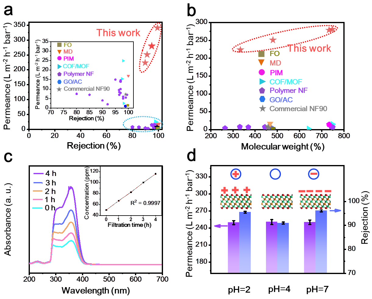 图四,抗生素分离性能对比和MXene膜分离机理解释。