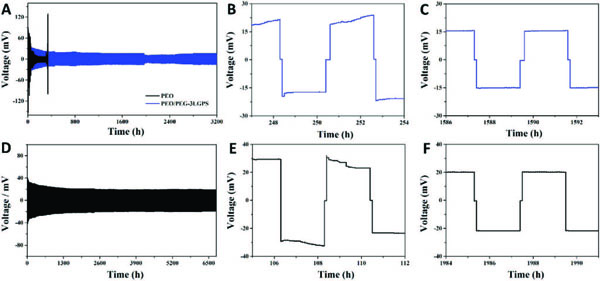 A)PEO(黑色线)和PEO/PEG-3LGPS(蓝色)作为电解质,在50℃下的恒定电流密度为0.5 mA cm-2的恒流循环。