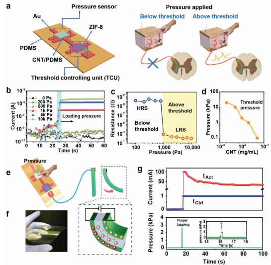 该团队报道了一种可响应触觉压力进行电化学致动的人工体神经反射弧。当压力探测器探测到的压力超过刺激阈值时,基于MOF材料的阈值控制单元被激活并触发电化学致动器完成响应致动行为。研究认为,这一响应机制模仿了神经系统中的悉无律。进一步的实验证明,将这一反射弧集成到机器中完全可以仿生婴儿掌握反射弧。这一研究为发展下一代人机界面和神经义肢提供了新的思路。