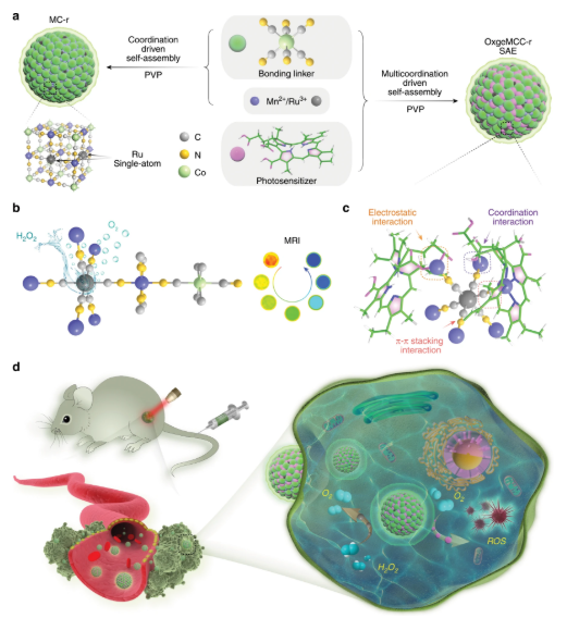 赵彦利等人报道了一种安全、多样化的自组装光动力学试剂–OxgeMCC-r 单原子酶。这种纳米酶由单原子钌作为催化活性位点固定到Mn3[Co(CN)6]2MOF材料上,之后这一材料装载光敏剂Ce6可作为能够产生氧气的类过氧化氢酶的纳米酶材料。研究制备得到的OxgeMCC-r具有明确的形貌、均一的尺寸分布以及高载药量。当纳米酶进入肿瘤组织,其中的单原子钌可以与内源性的过氧化氢进行反应产生氧气,缓解肿瘤的乏氧状态,实现高效的光动力学治疗。