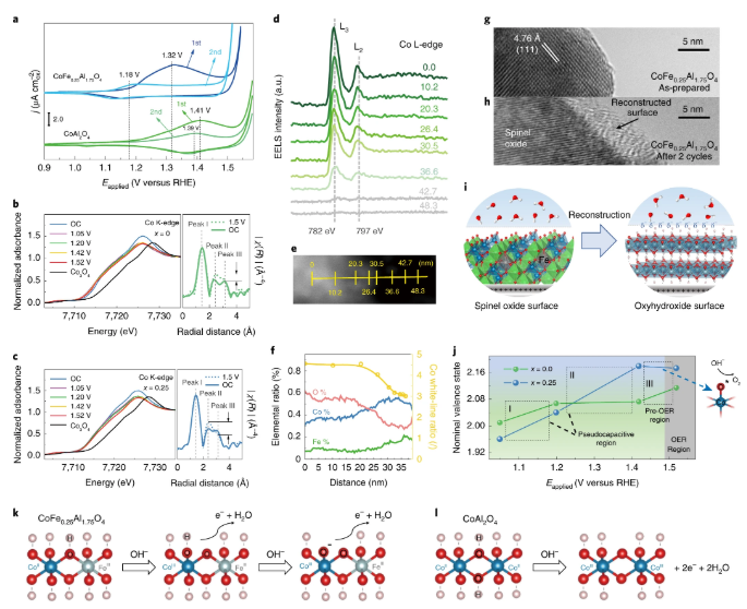 Iron-facilitated dynamic active-site generation on spinel CoAl2O4 with self-termination of surface reconstruction for water oxidation. Nature Catalysis, 2, 763–772(2019).