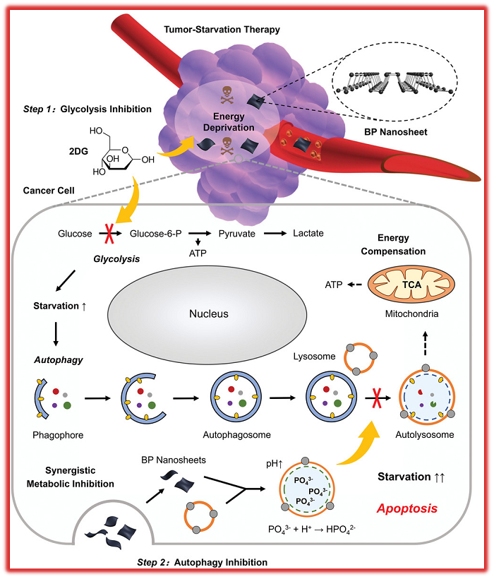 中科院上海硅酸盐研究所施剑林院士和陈雨研究员等人首次致力于使用BP纳米片作为自噬抑制剂来增强肿瘤饥饿疗法。抑制糖酵解会使癌细胞严重丧失能量,但此操作也会激活自噬反应,以“消耗”自身的成分来维持生存。BP纳米片阻止自噬通量和随后的代谢途径,最终使癌细胞饿死。体外和体内的结果均证明了BP和2DG之间的协同作用。研究人员后续研究是实施正交试验,以优化BP和2DG之间的比例,以获得更好的治疗效果。预期通过同时阻断营养供应的外源性和内源性途径的这种联合策略可能对肿瘤特异性纳米疗法的未来设计非常有用。