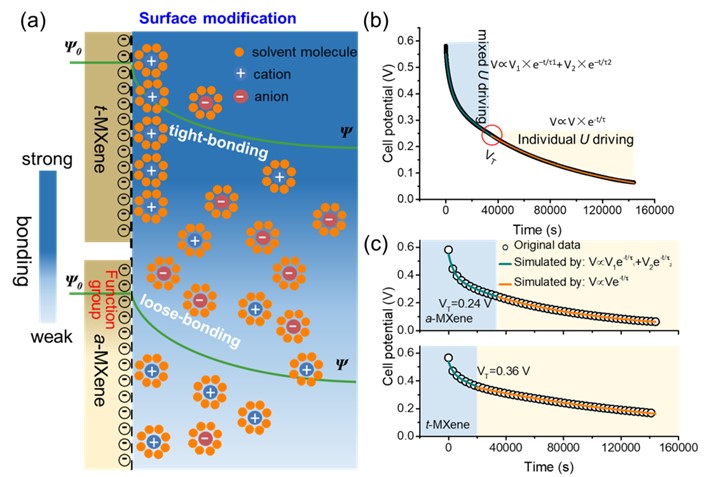 (a) 不同的紧密键合模型的示意图。(b) 不同的键合模型导致了混合自放电机制。(c) 通过调控界面化学,实现调控自放电过程的策略。