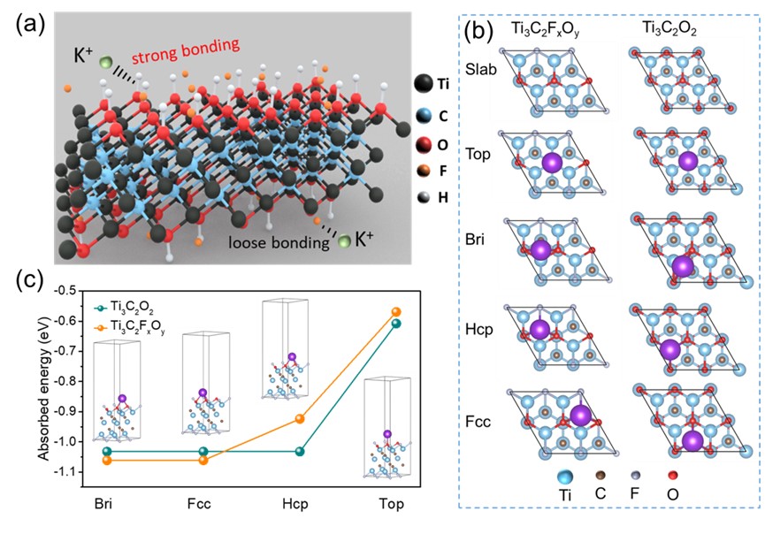 (a) 通过调节MXene表面官能团从而缓解自放电的示意图。(b) 不同的功能化Ti3C2Tx吸附K原子的结构图。(c) 不同位置的吸附能。