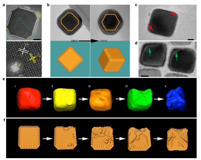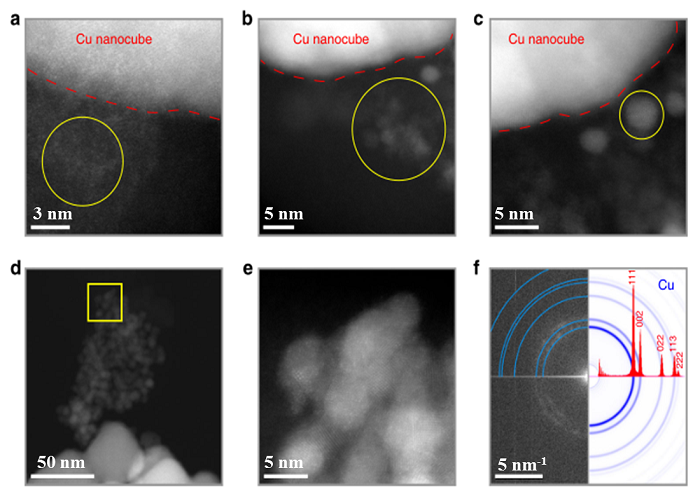 了解了整个过程的变化,作者就进一步深挖变化,到底三兄弟的变化是怎样的变化。其中的代表就是41 nm的铜方块“二哥”,可以看到铜方块的表面基本生成的是3-5 nm的小颗粒,这些小颗粒被证明是铜金属颗粒,这些小颗粒还是很多颗聚集在一起的,那到底是单个铜方块溶解的颗粒聚集在一起的还是多个铜方块溶解的小颗粒聚集在一起的?相信大家一开始都没想过这个问题吧,所以作者已经做好完全的准备,并揭开了这一问题的答案,没错,这些聚集的小颗粒是由多个铜方块溶解的小颗粒聚集而成的,看来溶解出来的小颗粒铜金属有点不安分呢!