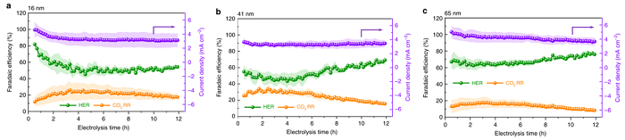 确定了铜方块兄弟们的形态变化,接下来就来看看这些变化对性能的影响了,毕竟催化活性是衡量催化剂性能的最终标准。二氧化碳还原(CO2RR)与氢气还原(HER)在测试过程中是竞争关系,而催化剂的主要目的是抑制HER促进CO2RR,从结果中可以看出,16 nm铜方块小兄弟对HER比较有想法,所以他开始的HER催化效率比较高,但随着时间的推移可以看到他最后还是表明了衷心,对CO2RR的促进作用在逐步增长直至稳定。转到41 nm和65 nm的铜方块“二哥”和“大哥”,随着其结构的变化,他们的HER开始都是趋于平稳的,而CO2RR略有上升,但是变化却不会一成不变,一定时间后他们的HER开始上升,CO2RR下降,只是65 nm的铜方块大哥发生的速度要比41 nm的铜方块二哥要慢一些。综合结果来看,铜方块三兄弟的变化对CO2RR的催化性能是有影响的,但是大尺寸的哥哥们的结构相对要稳定一下,但是再次聚集到铜方块表面的铜金属团聚物却没有了原来的催化效果,而是抑制了CO2RR的发生,说明铜方块的结构变化和CO2RR电化学行为之间有很强的相关性。