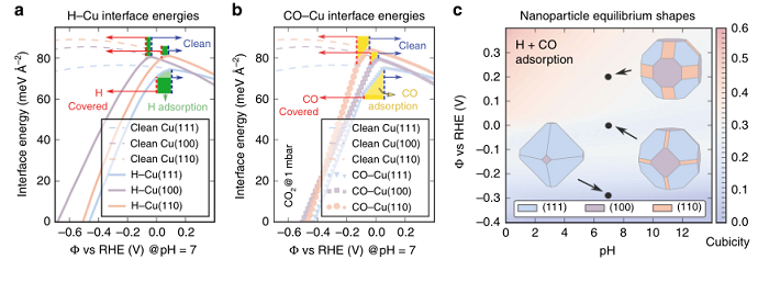 除去形貌的影响,作者还观察到不同电压条件下铜方块的变化,因此为了提供更加电压对材料的影响,理论模拟研究计算一下铜方块不同的晶面在不同电压下还原CO2的产物来确定电压对催化剂的影响。结果可得在理想条件下,理论计算可以得出铜方块的溶解与电解质的PH,选择和浓度无关,而施加的负电位则促使了铜方块的降解。从Cu(111)、(100)和(110)表面的界面自由能变化可以看出,原始铜块表面是稳定的。负电位越大,H/CO吸附越大,这反过来又推动从电极到吸附物质的电子转移所形成的电化学界面;因此,对于完全覆盖的催化剂表面其界面自由能大大降低。负界面能通过增加Cu(111)、(100)和(110)的绝对表面积来驱动铜方块的溶解。最后作者还发现,界面自由能(包括H、CO和共吸附的H+CO端)与电势和PH值相关的Wulff-shapes,可以发现在实际的CO2RR条件下,随着电势的减小,其(111)、(100)和(110)晶面组成的铜方块体积随之减小。