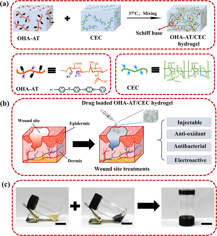 为了防止伤口感染,进一步发展具有出色的伤口修复和皮肤再生的新型伤口敷料具有重要意义。西安交通大学郭保林课题组设计了一种具导电性、理想的抗氧化能力和抗菌性能的可注射水凝胶敷料用于皮肤损伤的修复。在生理条件下,通过混合生物相容性聚合物N-羧乙基壳聚糖和氧化的透明质酸接枝苯胺四聚体聚合物,制备了导电的抗氧化剂水凝胶。该水凝胶表现出稳定的流变性、高溶胀比、合适的胶凝时间、良好的体外生物降解性、电活性和自由基清除能力。加入抗生素阿莫西林后,水凝胶显示出良好的抗菌性能,可有效防止伤口感染。、在全厚度皮肤缺损模型中,添加苯胺四聚体的水凝胶可显着加快伤口愈合速度,并具有更高的肉芽组织厚度、胶原蛋白分布和更多的血管生成作用。该研究为设计电活性可注射水凝胶作为伤口敷料提供新的研究思路,在伤口愈合等医疗体系中具有广阔应用前景。[10]相关研究以“Degradable conductive injectable hydrogels as novel antibacterial, antioxidant wound dressings for wound healing”为题,发表在Chemical Engineering Journal。