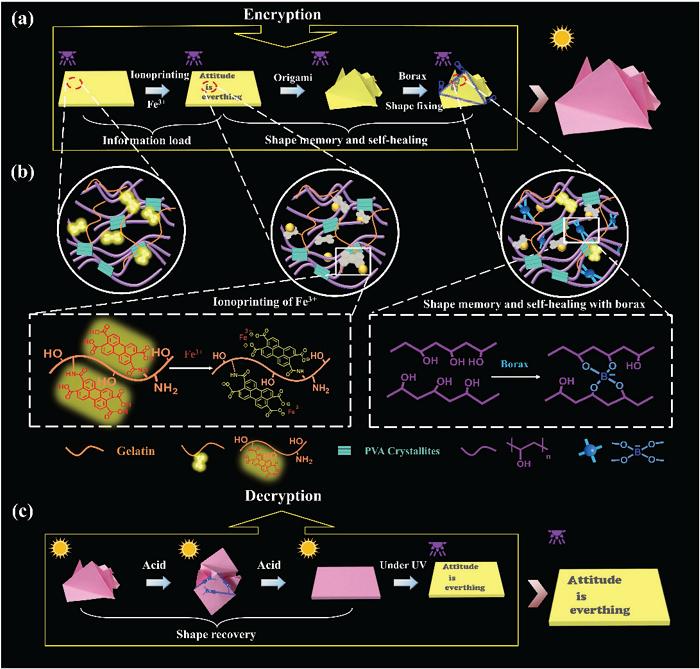 为了防止假冒活动和信息泄漏,信息存储和相应的加密/解密具有重要的现实意义。中国科学院宁波材料技术与工程研究所陈涛课题组提出了将可控的离子印迹将信息存储到荧光水凝胶上用于信息的分层和多维解密。通过将芘和羧基结合到聚合物水凝胶网络中,利用Fe3+电离印刷进行整合,实现荧光和形变行为的调控。 Fe3+向荧光水凝胶中的扩散可淬灭部分的荧光,并与羧基螯合以生成各向异性结构同时产生形变行为。当暴露于紫外光并放入水中时,基于荧光猝灭的2D信息和基于致动的3D信息可以被分层解密。通过用H+代替Fe3+来删除存储的信息,从而使荧光水凝胶成为可回收的信息存储材料。该工作可以为设计和制造用于分层和多维信息加密的新型软设备提供新的见解,以应对假冒和机密信息泄露这一类现实问题。[14]相关研究以“Ionoprinting controlled information storage of fluorescent hydrogel for hierarchical and multidimensional decryption”为题,发表在Sci China Mater.。