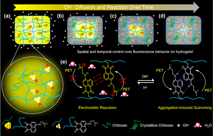强而可调谐荧光的聚合物水凝胶在生物成像、传感、信息存储等方面具有广泛的潜在应用而备受研究兴趣。中国科学院宁波材料技术与工程研究所陈涛课题组报道了基于常规聚集诱导猝灭型(萘二甲酰亚胺荧光团)的高荧光聚合物水凝胶并对其荧光行为进行了时间和空间的调控。在壳聚糖-乙酸溶液中通过一锅法将含萘二甲酰亚胺的单体和丙烯酰胺进行自由基共聚制备水凝胶。水凝胶具有很强的荧光强度归因于质子化萘二甲酰亚胺基团接枝到聚合物链上的协同锚固和稀释作用,这导致聚集诱导猝灭发光剂之间产生静电排斥,并降低了相邻二甲胺基团对萘二甲酰亚胺荧光团的光诱导电子转移效应。在碱性条件下去质子化后,光诱导电子转移效应和聚集诱导猝灭效应都再次起作用以极大地猝灭荧光,使水凝胶具有pH敏感的荧光发射响应。通过该水凝胶开发一种扩散反应方法用于在空间和时间上控制其荧光行为,并进一步开发了离子转移印刷辅助扩散反应方法用于在水凝胶上制备高精度和有意义的荧光图案。利用荧光图案在日光下不可见而在特定的紫外线照射下会显现的原理,为信息安全和传输中的应用提供一种新的策略。[13]相关研究以“Aggregation-Caused Quenching-Type Naphthalimide Fluorophores Grafted and Ionized in a 3D Polymeric Hydrogel Network for Highly Fluorescent and Locally Tunable Emission”为题,发表在ACS Macro Lett.。