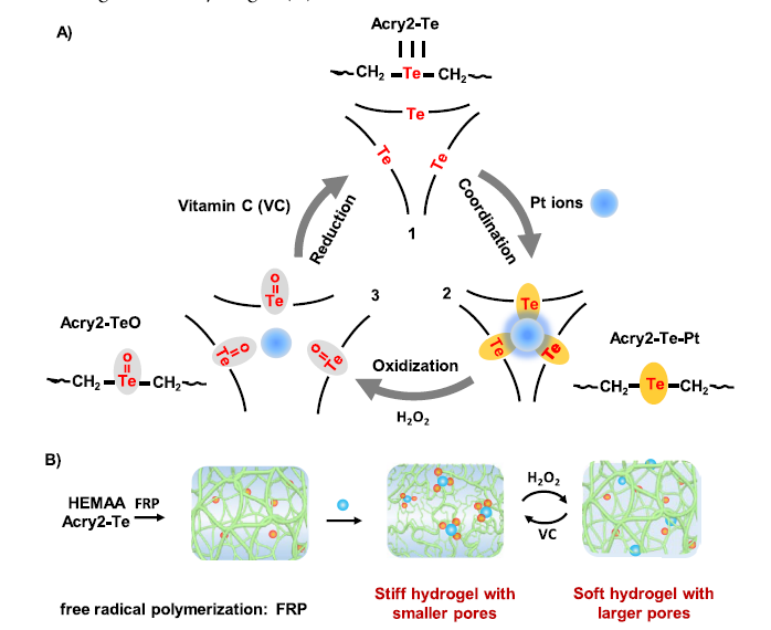 随着动态化学的发展,有机碲化学打开了动态反应新领域的大门,为发展具有可切换机械性能的材料提供了新的方法。天津大学仰大勇课题组受生物启发报道了基于氧化还原的机械响应水凝胶,它是通过碲醚和铂离子之间的动态配位形成的。低电负性和良好s电子给体能力的碲醚有助于其与铂离子的配位。配位相互作用是具有氧化还原活性的:碲醚在氧化时(例如H2O2)可以与铂离子解离,因为极性溶剂的作用会大大降低氧化碲醚的热力学活性;通过对氧化的碲醚还原(例如维生素C)容易再生与铂离子的配位相互作用。当含单体的碲醚与N-羟乙基丙烯酰胺之间的共聚将配位体系引入到水凝胶的聚合物网络中时,由于碲醚和铂离子之间的动态配位相互作用,水凝胶在氧化还原刺激下显示出可切换且可调节的微孔结构和机械强度。碲醚和铂离子的动态配位相互作用赋予了水凝胶微观结构和力学可逆的调节作用。这项工作提供了新的动态配位化学和新的策略来制备机械响应水凝胶。[2]相关研究以“Bioinspired Mechanically Responsive Hydrogel upon Redox Mediated by Dynamic Coordination between Telluroether and Platinum Ions”为题,发表在Chem. Mater.。