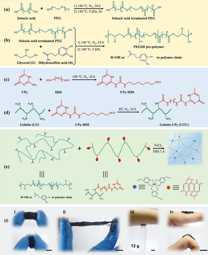 开发具有高愈合效率和光热抗菌活性的物理双网络可移动水凝胶粘合剂,以应对多药耐药细菌感染、伤口闭合和伤口愈合具有重要意义。西安交通大学郭保林课题组设计了一种在生理条件下可注射的双网络物理自修复水凝胶粘合剂用于治疗多种药物耐药细菌感染和全层皮肤切口/缺陷修复。水凝胶粘合剂由儿茶酚-Fe3+配位交联的聚癸二酸甘油酯-共聚乙二醇-g-邻苯二酚和四重氢键交联的脲基-嘧啶酮改性明胶组成。水凝胶具有出色的抗氧化性、NIR / pH响应性和形状适应性。另外,水凝胶表现出快速的自我修复、良好的组织粘附性、降解性、光热抗菌活性以及近红外辐射或酸性溶液洗涤辅助的可去除性。水凝胶对皮肤的创伤具有良好的止血作用,对耐甲氧西林的金黄色葡萄球菌(MRSA)具有很高的杀灭率,比医用胶和外科缝合线具有更好的伤口闭合和皮肤切口愈合能力。水凝胶可以通过调节炎症、加速胶原蛋白沉积、促进肉芽组织和血管形成来促进全层皮肤缺损伤口愈合。该物理双网络水凝胶粘合剂是出色的多功能敷料,可用于治疗体内MRSA感染、伤口闭合和伤口愈合。[6]相关研究以“Physical Double-Network Hydrogel Adhesives with Rapid Shape Adaptability, Fast Self-Healing, Antioxidant and NIR/pH Stimulus-Responsiveness for Multidrug-Resistant Bacterial Infection and Removable Wound Dressing”为题,发表在Adv. Funct. Mater.。