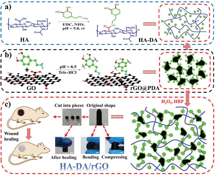 在临床应用中具有包括粘附性、抗菌、自由基清除能力以及良好的机械性能的多功能可注射纳米复合导电水凝胶敷料用于增强全厚度皮肤伤口再生具有重要意义。西安交通大学郭保林课题组制备了一系列透明质酸接枝多巴胺和氧化石墨烯(H2O2 /辣根过氧化物酶系统还原)组成的止血抗氧化剂导电光热抗菌水凝胶用于伤口包扎。该水凝胶显示出高溶胀、可降解、可调节的流变特性以及与人类皮肤相似或更好的机械特性。聚多巴胺赋予的抗氧化活性、组织粘附性、止血能力、自愈能力、电导率和近红外辐射增强了水凝胶的体内抗菌性能。此外,药物释放和抑制区域测试显示出水凝胶的持续药物释放能力。水凝胶敷料可通过上调CD31的生长因子表达来显着增强血管形成,改善肉芽组织厚度和胶原蛋白沉积,促进伤口闭合,并且比市售Tegaderm膜具有更好的治疗效果。这些具有持续药物释放特性的止血抗氧化导电水凝胶给全层皮肤修复提供一种新的策略。[7]相关研究以“Adhesive Hemostatic Conducting Injectable Composite Hydrogels with Sustained Drug Release and Photothermal Antibacterial Activity to Promote Full-Thickness Skin Regeneration During Wound Healing”为题,发表在Small。