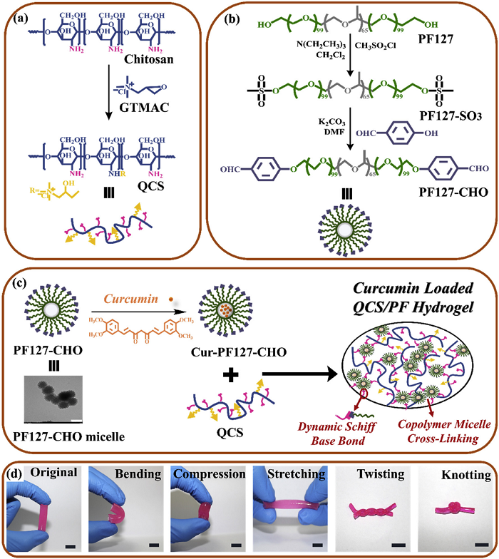 自愈性、粘附性和合适的机械性能的优异伤口敷料在关节皮肤伤口愈合中具有重要的实践意义。西安交通大学郭保林课题组设计了一种具有自我修复功能的可注射胶束/水凝胶复合材料用作关节皮肤损伤的伤口敷料。在生理条件下,通过结合动态席夫碱和共聚物胶束交联以及混合季铵化壳聚糖和苯甲醛封端的F127制备了一系列水凝胶。水凝胶作为伤口敷料具有多功能性,包括抗菌性能、pH依赖性、生物降解和可释放性。该水凝胶敷料显示出与人类皮肤相当模量的拉伸和压缩性质,其中良好的粘附性和快速的自愈能力以承受变形,而且还表现出有效的止血性能和生物相容性。此外,负载姜黄素的水凝胶显示出良好的抗氧化能力和pH响应释放曲线。在全层皮肤缺损模型中,姜黄素负载的水凝胶可显着加速伤口愈合速度,并具有更高的肉芽组织厚度、胶原蛋白分布以及上调的血管内皮生长因子。该抗菌粘合水凝胶作为关节皮肤伤口愈合的敷料具有广阔的前景。[8]相关研究以“Antibacterial adhesive injectable hydrogels with rapid self-healing, extensibility and compressibility as wound dressing for joints skin wound healing”为题,发表在Biomaterials。