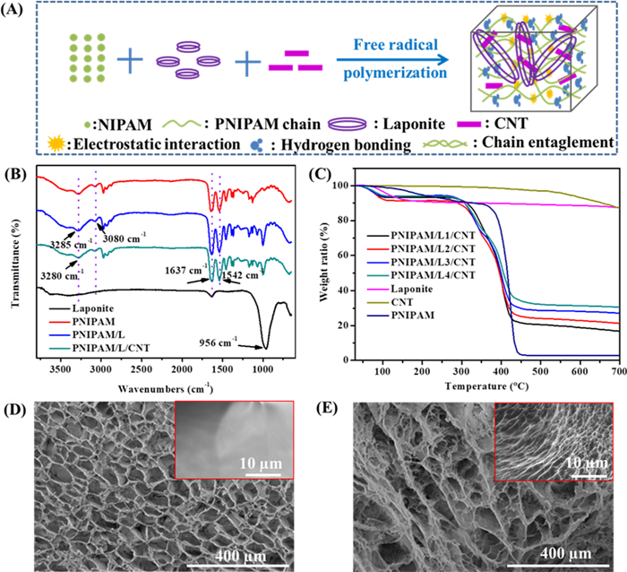 自修复的粘性导电水凝胶在可穿戴电子设备,柔性可印刷电子设备和组织工程支架中具有重要意义。西安交通大学郭保林课题组提出了基于纳米粘土(膨润土)、多壁碳纳米管和N-异丙基丙烯酰胺的导电自修复纳米复合水凝胶。该纳米复合水凝胶显示出良好的导电性、快速的自愈和粘合性能、柔性和可拉伸的机械性能以及对近红外光和温度的高敏感性。在基质中具有相互连接的多壁碳纳米管网络,纳米复合水凝胶表现出大孔结构。将这些可拉伸导电纳米复合水凝胶应用在人体运动监测中的传感器及其3D打印性能领域具有良好的效果。该导电水凝胶的良好细胞相容性使得在刺激响应性电子设备、可穿戴电子产品等方面具有广阔的应用前景。[9]相关研究以“Stimuli-Responsive Conductive Nanocomposite Hydrogels with High Stretchability, Self-Healing, Adhesiveness, and 3D Printability for Human Motion Sensing”为题,发表在ACS Appl. Mater. Interfaces。