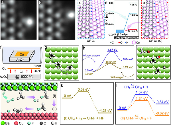 (c-e)在有氧和无氧状态下的石墨烯边缘生长的示意图和相对应的DFT计算;