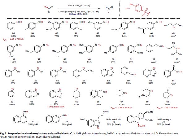 北卡罗来纳大学教堂山分校的David A. Nicewicz(通讯作者)团队发文报道了一种最大激发态氧化电势可达−3.36V的中性吖啶(acridine)自由基。谱学、计算和化学研究显示,这一弯曲分子间电荷转移物种展现出群体性的高能双重激发态,同时研究人员也观察到了可观的光还原行为。研究还进一步证明,这一PET催化剂不仅能够参与并实现多种需要碱金属还原剂的化学反应,还能在通常需要溶解性金属还原剂的有机转变过程中发挥作用。2020年04月01日,相关成果以题为“Discovery and characterization of an acridine radical photoreductant”的文章在线发表在Nature上。