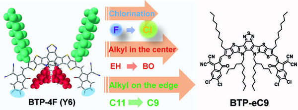 空间填充模型突出显示了两种烷基链(以绿色和红色显示)。在实验室中对Y6的化学改性:第一步:氟化到氯化;第二步:优化吡咯上的烷基链;第三步:调整边缘上的烷基链(本工作中,C9和C7分别取代边缘上的C11制备BTP-eC9和BTP-eC7)。