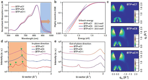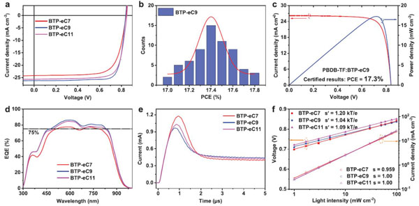 近日,中国科学院化学研究所侯剑辉团队的姚惠峰等人与国家纳米科学中心和瑞典林雪平大学合作,对Y6衍生物边缘的烷基链进行了优化,并研究了它们在OPV电池中的应用。将正十一烷基(C11)缩短为正壬基(C9)和正庚基(C7),合成了名为BTP-eC9和BTP-eC7的NFAs。与BTP-eC11相比,具有较短烷基链的BTP-eC9显示出合适的溶解度以及适当的结晶性,降低了Urbach能,并增强了载流子迁移率。值得注意的是,由于短路电流密度和填充因子的提高,基于BTP-eC9的单结OPV电池获得了17.8%(17.4±0.2%)的PCE,认证值为17.3 %。然而,进一步缩短烷基链,导致BTP-eC7的溶解度显著降低。BTP-eC7的加工性能差,光伏应用不佳。这些结果表明,通过对烷基链的精细优化,可以获得优异的光伏性能。团队预计,通过进一步优化供体材料和器件加工工程,如多组分共混和形貌控制,可以实现更高的PCE。该成果以题为“Single-Junction Organic Photovoltaic Cells with Approaching 18% Efficiency”发表在了Adv. Mater.上。通讯作者是姚惠峰博士,第一作者是崔勇博士。