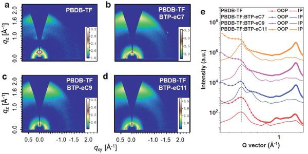 a-e)2D GIWAXS图:a)PBDB-TF,b)PBDB-TF:BTP-eC7,c)PBDB-TF:BTP-eC9和d)PBDB-TF:BTP-eC11 。