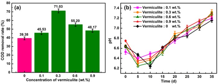 图2 引入不同含量蛭石促进剂厌氧共发酵系统COD降解率(a)与pH(b)的变化规律