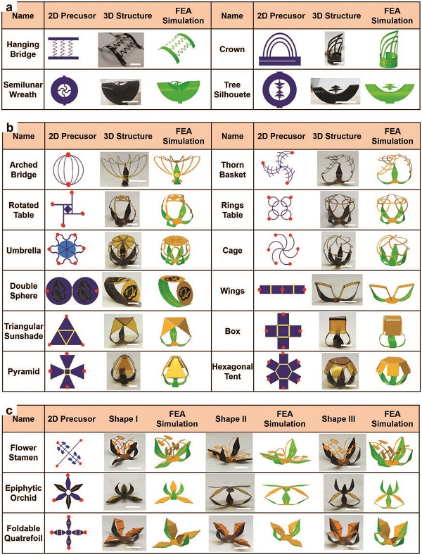 图二、由电热驱动触发的一系列力学组装三维结构的实验和计算研究