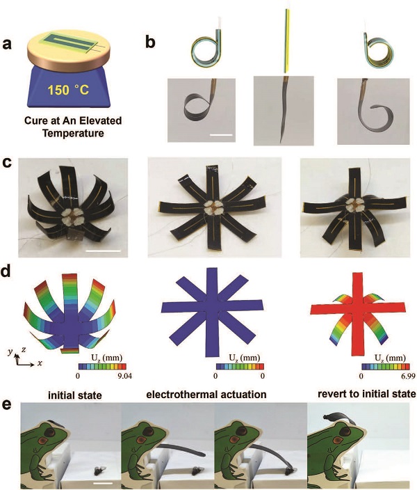 图三、制备过程中由热应力引起的双向形状转变的实验和计算研究