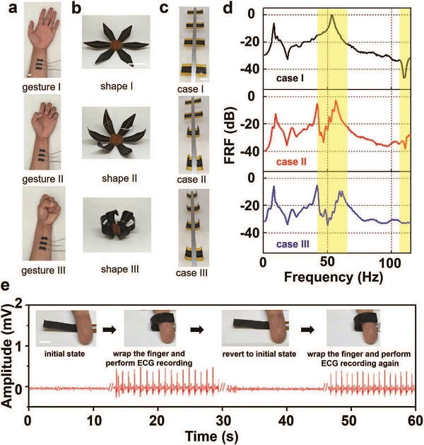(a~d)通过实时的肌电图监测,a)人的姿态被用来控制,b)花状结构的3D组装,c)弹性材料的构型重构,d)可调带隙行为;