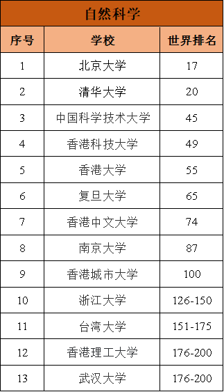 接下来让我们看看国内高校在世界大学TOP200中的表现,以下是和我们关系比较密切的材料科学、化学学科排名