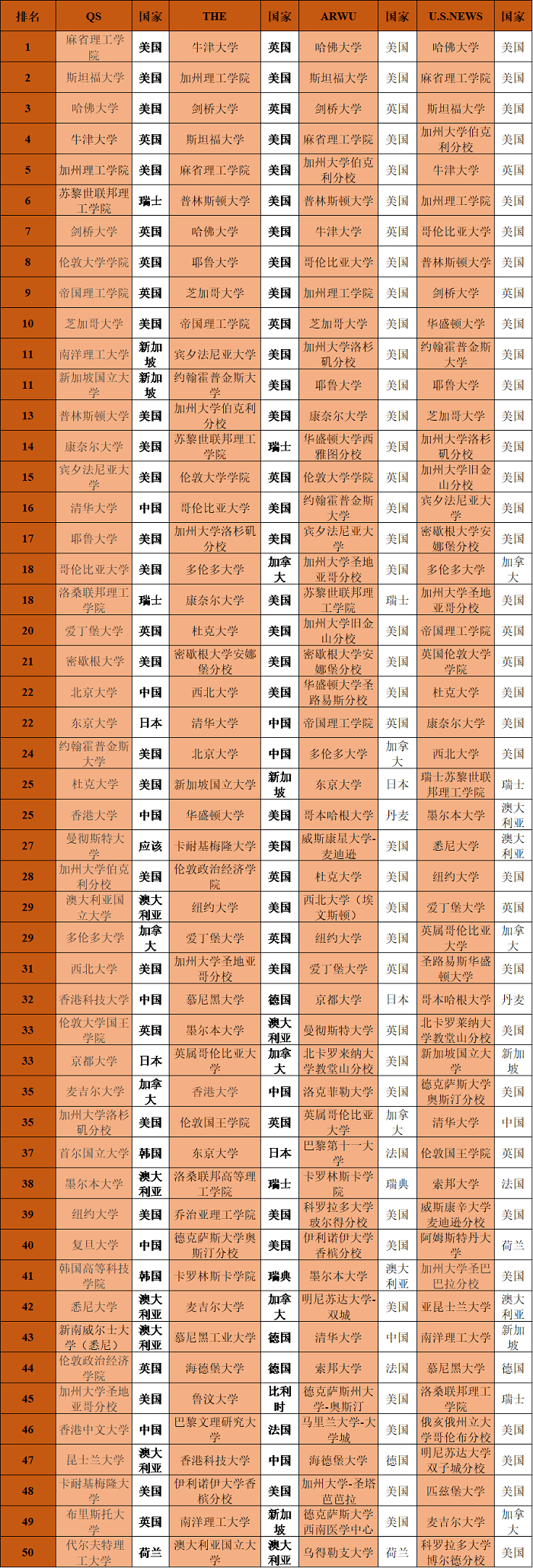 QS、U.S. NEWS、THE、ARWU是目前世界上较为权威的四大世界大学排名,
