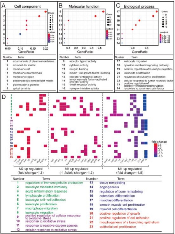 (D)M1/M2免疫微环境差异表达的细胞因子的热图样功能分类。