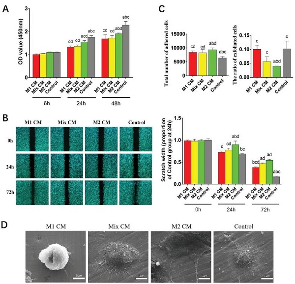 (D)在不同免疫微环境下,在光滑的钛合金圆盘上培养24 h的人牙龈上皮细胞的扩散和形态的代表性SEM图像。