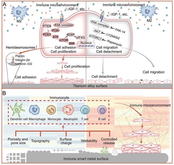 基于此,中山大学附属口腔医院的陈泽涛研究员和陈卓凡教授(共同通讯作者)联合报道了一种基于免疫调节的策略来调控免疫微环境,改善金属植入物软组织的整合。鉴于巨噬细胞在软组织对金属植入物反应中的重要作用,研究人员使用了巨噬细胞,并评估了M1和M2巨噬细胞免疫微环境的细胞因子特征对金属植入物软组织整合的潜在调节作用。然后描述了不同免疫微环境对模型金属植入物(钛合金盘)上培养的模型软组织细胞(人牙龈上皮细胞)的调节作用,并揭示了FAK-AKT-mTOR信号转导的潜在机制。为进一步证明这种概念,作者制备了IL-4/PDA(聚多巴胺)涂层钛合金植入物以调节M2巨噬细胞的极化,发现该植入物可改善体内金属植入物-软组织的整合。相信这种基于免疫调节的策略将改变原有的看法,并鼓励积极开发具有良好软组织整合特性的金属材料,从而提高金属植入物穿孔的成功率,拓宽其在软组织相关领域的应用。研究成果以题为“Immunomodulation-Based Strategy for Improving Soft Tissue and Metal Implant Integration and Its Implications in the Development of Metal Soft Tissue Materials”发布在国际著名期刊Adv. Funct. Mater.上。