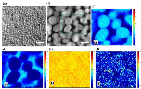 Fig.1 STEM images and STEM-EDS maps of the Y doped 65%molZrO2-35%molSiO2 nanocrystalline glass-ceramic (NCGC). (a) STEM-BF image showing an overview of the microstructure of the NCGC. Inset: The size distribution histogram of the ZrO2 nanoparticles (NPs). (b) STEM-HAADF image of ZrO2 NP. (c-f) STEM-EDS maps demonstrating the distribution of Zr, Si, O, and Y, respectively, within the region marked with green rectangle in (n).