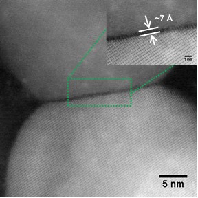 Fig.3 A STEM-HAADF image showing the grain boundary between ZrO2 NPs with a thin layer of intergranular glass film (IGF). The thickness of the IGF was approximately 7 Å (inset).