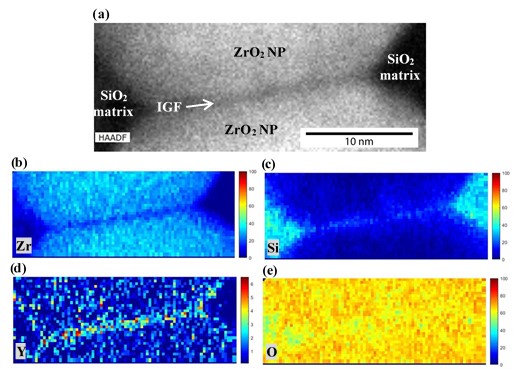 Fig.4 STEM-EDS analysis of an IGF. (a) STEM-HAADF image showing two adjacent ZrO2 NPs (brighter contrast) and the IGF (darker contrast); (b) Zr element STEM-EDS map; (c) Si element STEM-EDS map; (d) Y element STEM-EDS map; (E) O element STEM-EDS map.