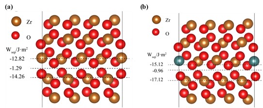 Fig.5 DFT calculation results. (a) Atomic structure for clean ZrO2 GB (without segregation) and the corresponding work of separation at three atomic layer (indicated by dash lines); (b) Atomic structure for a Y atom to segregate to ZrO2 GB and the corresponding work of separation (indicated by dash lines).