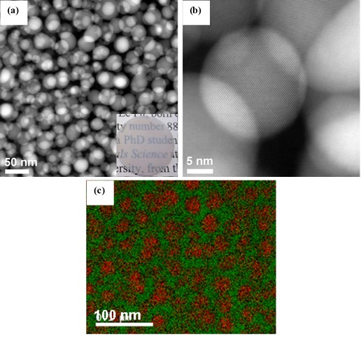 Fig.6 STEM-HAADF images (a-b) and EELS mapping (c) of the 35mol%ZrO2-65mol%SiO2 NCGC. EELS mapping shows the distinct elemental distribution of Zr (red) and Si (green).