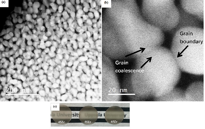 Fig.7 STEM-HAADF images (a-b) of 65mol%ZrO2-35mol%SiO2 NCGC and optical image (c) of the ZrO2-SiO2 NCGC with ZrO2 content of 45mol%(45Zr), 55mol%(55Zr), and 65mol%(65Zr). The samples have a thickness of approximately 1 mm.