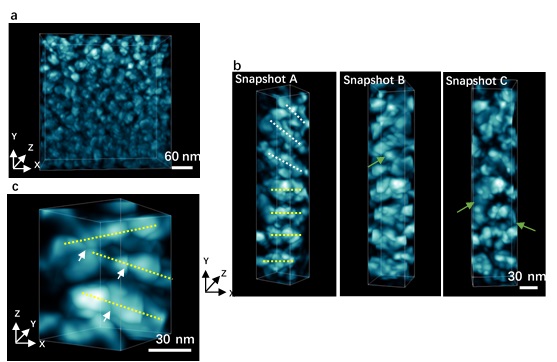 Fig. 8 Electron tomography results. (a) An overview of the 3D spatial distribution of ZrO2 NPs; (d) Near parallel ZrO2 nanofibers stacked in the Y-axis direction (indicated by yellow and white dash lines in Snapshot A). The nanofibers are connected in the Y-axis direction (marked by orange arrows); (c) ZrO2 NPs in nanofibers are connected by grain boundaries (marked by white arrows). The ZrO2 nanofibers (marked by yellow dash lines) also show a stacking order in the Z-axis direction.