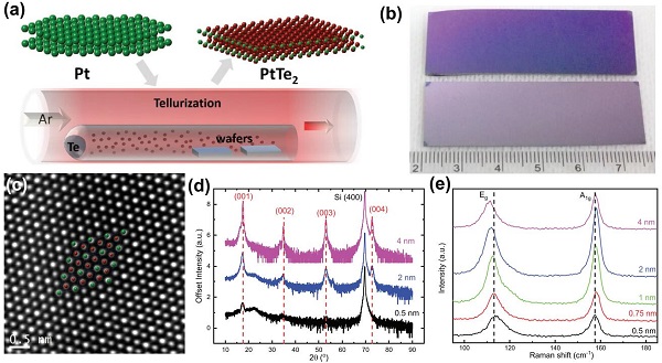 (a)将大型Pt薄膜转化为PtTe2薄膜的CVD工艺示意图;