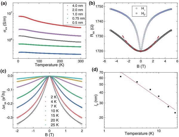 (c)PtTe2薄膜在H⊥和低温下的磁导,其中Δσxx=(L/Wt)/Rxx,L、W和t为PtTe2通道的长度、宽度和厚度;