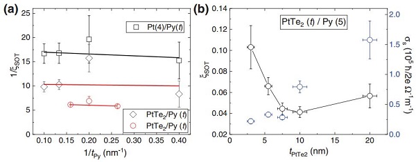 (a)PtTe2/Py和Pt/Py的1/ξSOT versus 1/tPy,以及相应的线性拟合;