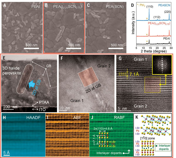 图4 钙钛矿薄膜的电学性质和2D钝化层中平面缺陷的观察